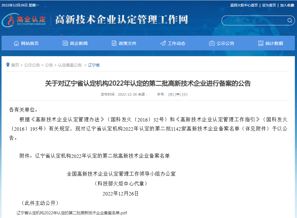 2022年12月26日,全國(guó)高新技術(shù)企業(yè)認(rèn)定管理工作領(lǐng)導(dǎo)小組辦公室正式發(fā)函,公布了遼寧省2022年認(rèn)定的第二批高新技術(shù)企業(yè)備案名單。沈陽(yáng)市萬(wàn)德富科技有限公司成功通過(guò)國(guó)家高新技術(shù)企業(yè)認(rèn)定。